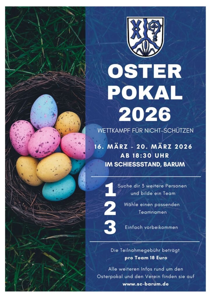 Der Schieß-Club-Barum e.V veranstaltet in der Woche vom 16. bis 20.März 2026 täglich ab 18:30 Uhr sein traditionelles Osterpokalschiessen. Als Gäste erwartet der Schützenverein wieder viele Pokalmannschaften der Damen und Herren, nicht nur aus dem Schützenbezirk Lüneburg, sondern auch aus dem Schützenverband Nordheide und Elbmarsch sowie aus dem Schützenkreis Sachsenwald. Es wird auf den Flindtpokal, den Schulzpokal und den Damenpokal geschossen.